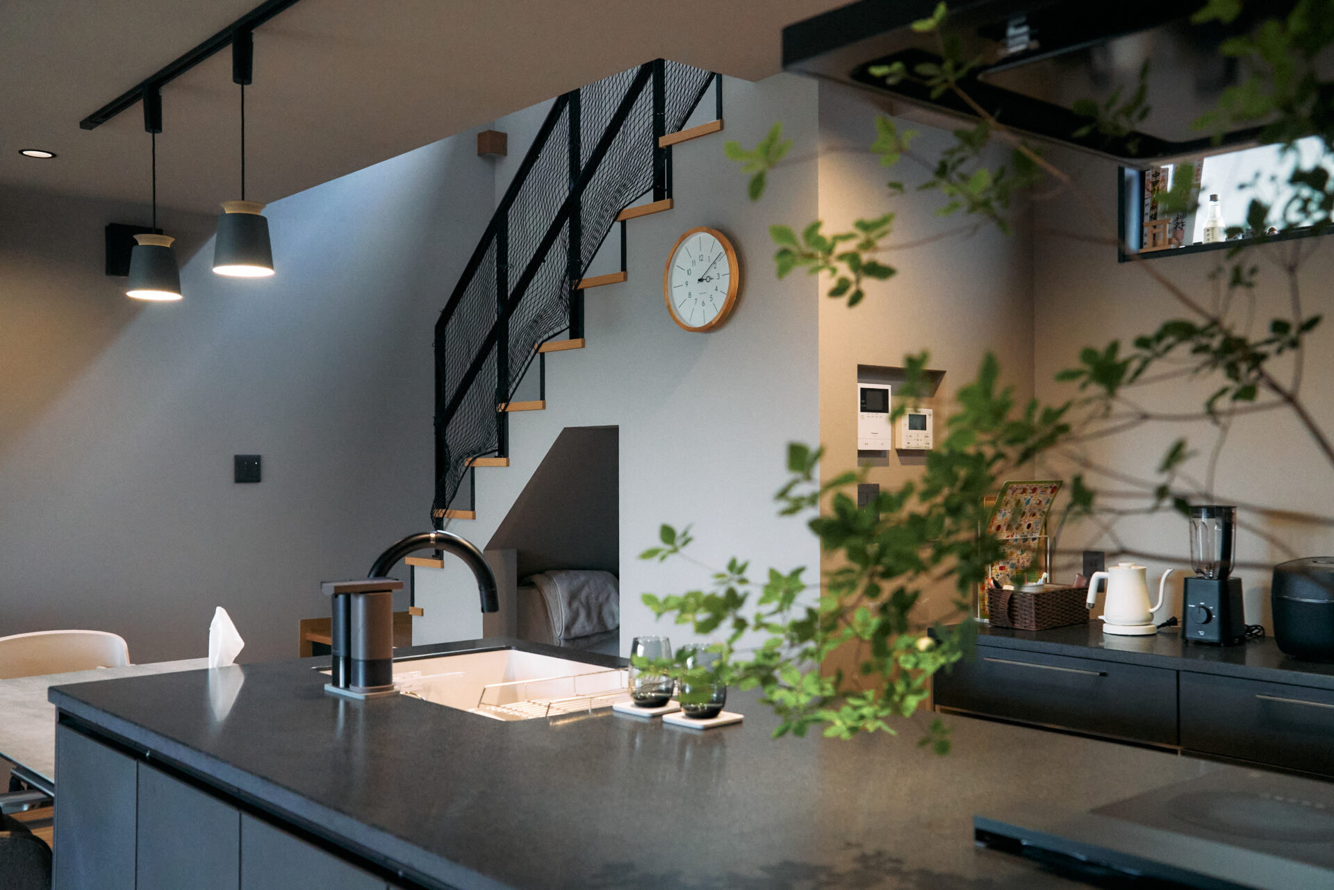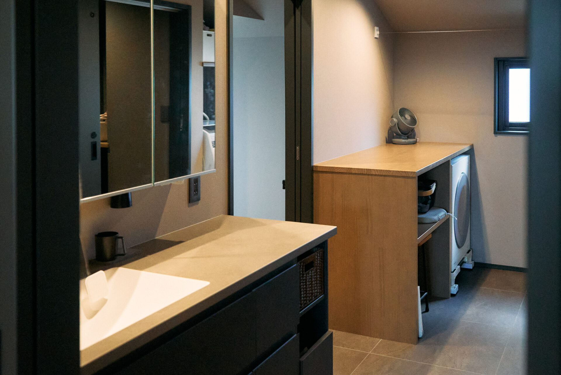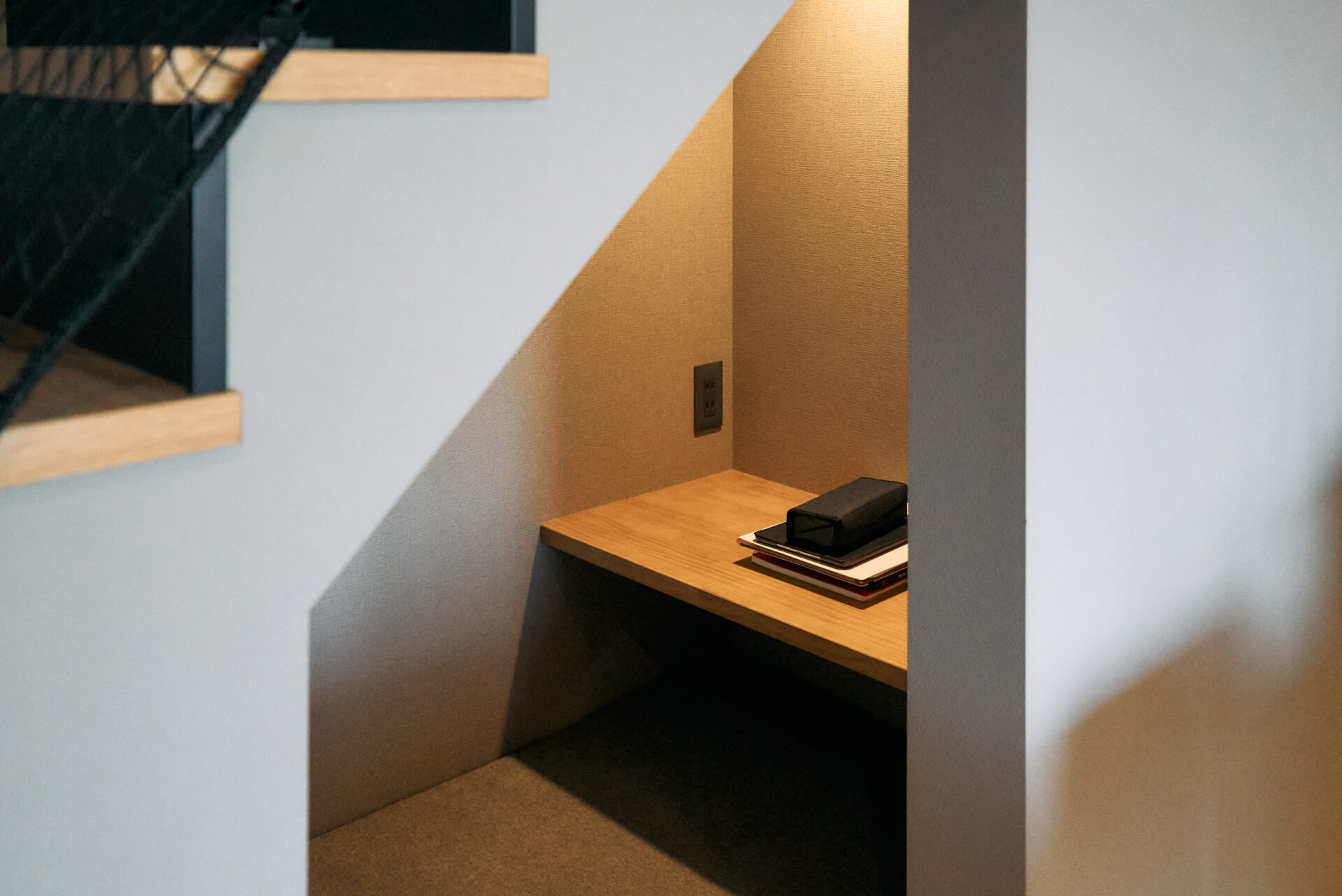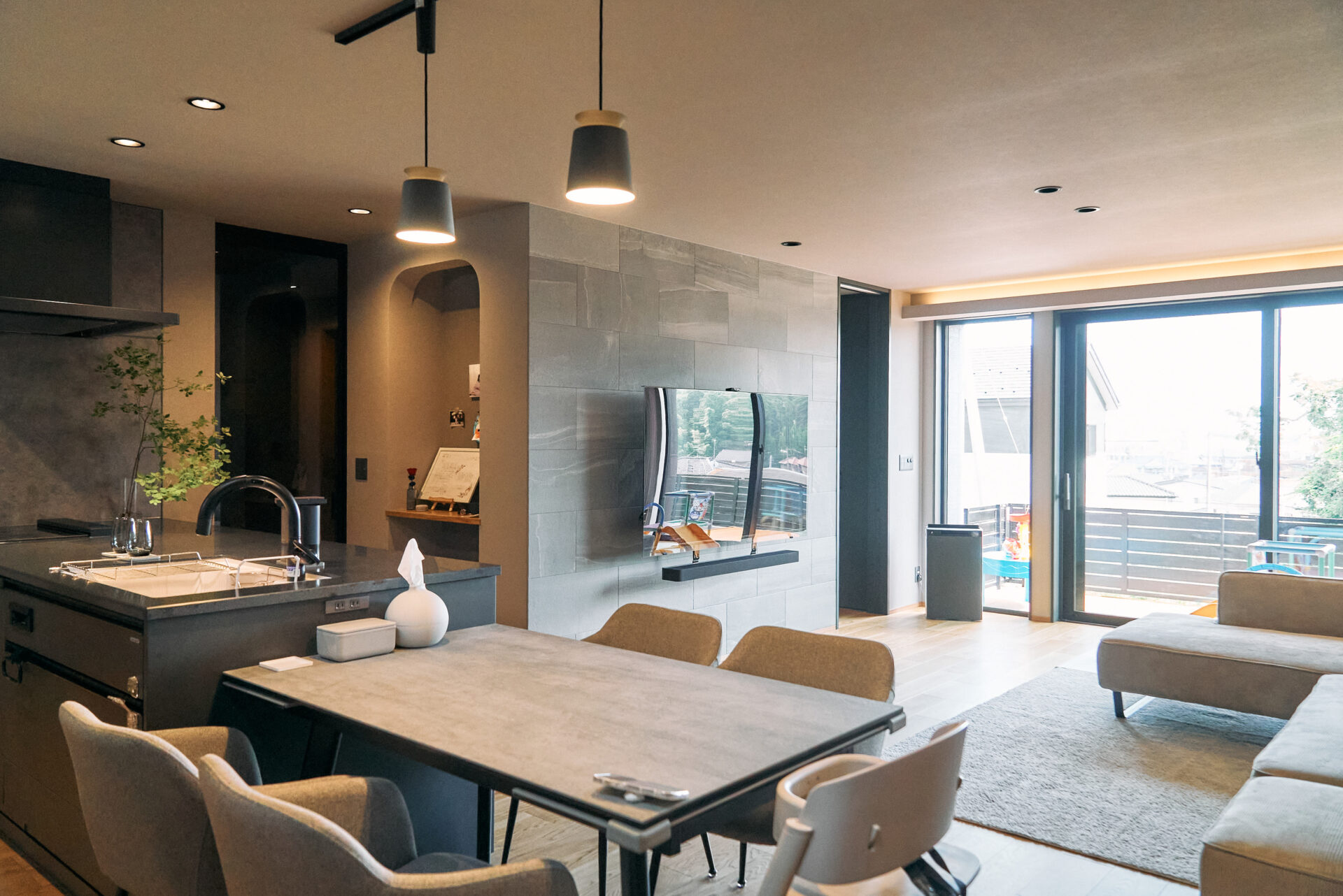新しい家で一番こだわったのは、ホテルライクな空間づくりです。壁紙や小物をグレーや黒に統一することで、落ち着いた雰囲気に仕上げました。また、「LDKを少しでも広くしたい」という強い思いがあったため、水回りはすべて2階に配置し、家族が一番長い時間を過ごすリビングにゆとりを持たせる工夫をしています。夜は間接照明のやわらかい光の中で生活したいと考え、カタログとにらめっこしながら照明器具もじっくりと選びました。